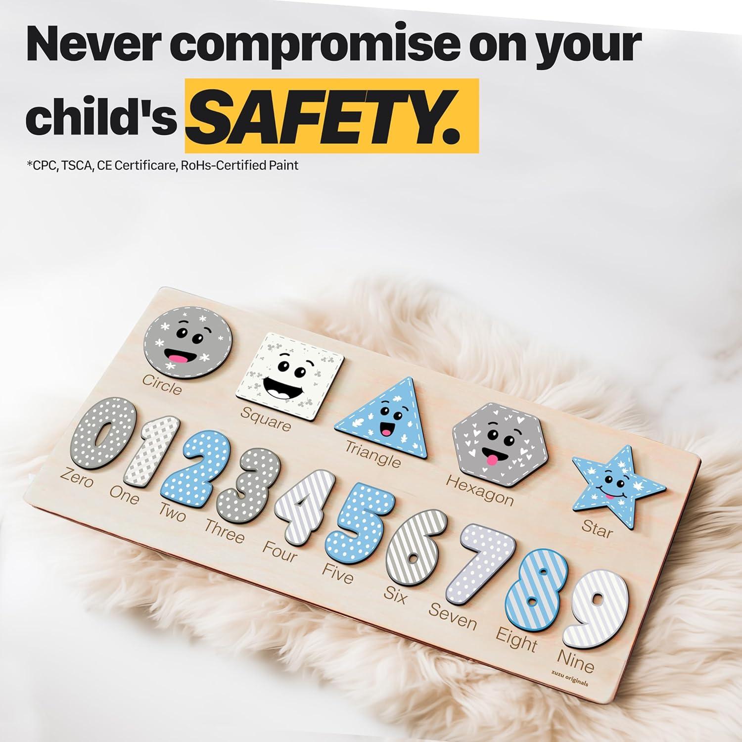 A Toy with Educational Benefits: Our wooden puzzle enhances motor skills, coordination, and focus. Promotes problem-solving, self-confidence, and happiness Introduces shapes, numbers, and spelling. Encourages exploration and curiosity.